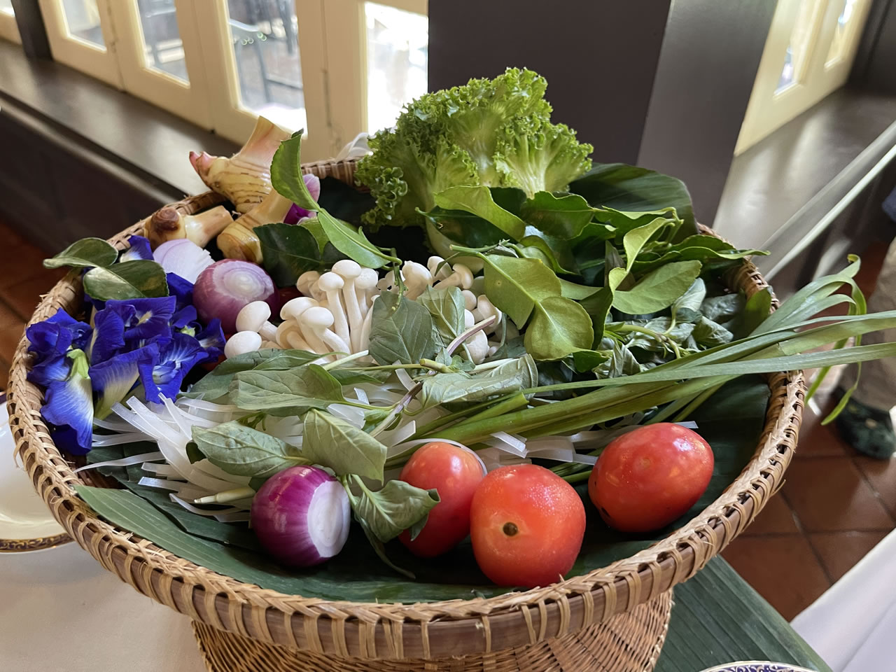 We were welcomed with a delicious drink made from pea flower and given Dusit Thani cooking aprons. The aprons are included in your cooking class package. The classes are not daunting large groups but more intimate small groups allowing for one-on-one learning. In our class, it was a group of six – a perfect size. The small group meant I had a lot of interaction with the chef, which was great because I had many questions about the ingredients.